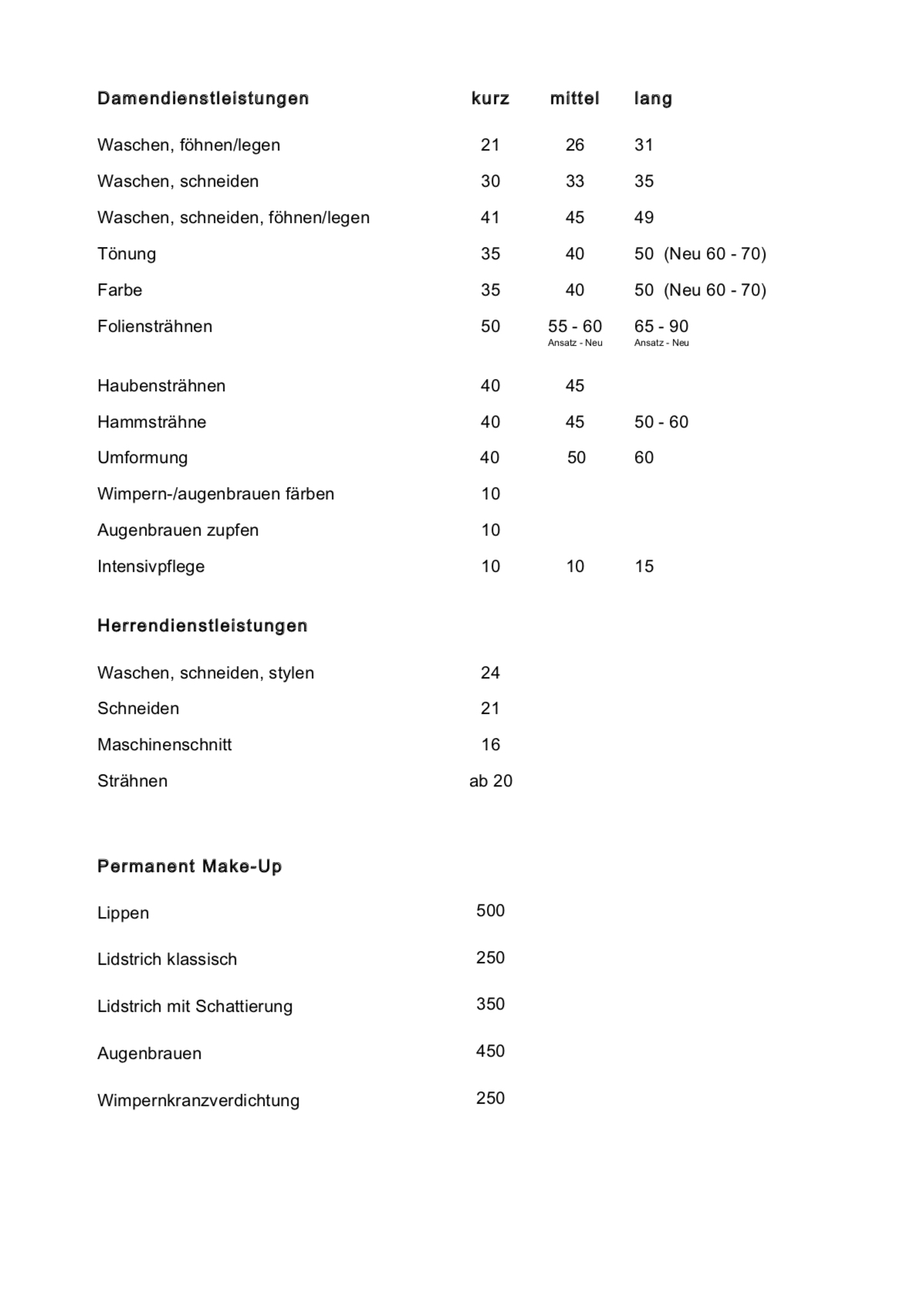 DamendienstleistungenkurzmittellangWaschen, föhnen/legen273135Waschen, schneiden384040Waschen, schneiden, föhnen/legen455050 (Locken 60)Tönung405050 (Neu 60-70)Farbe405050 (Neu 60-70)Foliensträhnen60ab 80ab 90Haubensträhnen4045Kammsträhne404550 – 60Umformung485560Wimpern-Augenbrauen färben10Augenbrauen zupfen10Intensivpflege101015HerrendienstleistungenWaschen, schneiden, stylen30Schneiden27Maschinenschnitt20Strähnen25Kinder bis 12 Jahren25Zusätzliche Dienstleistungen bei uns im HausNägel, Wimpern, Dauerhafte Haarentfernung und Micronidling: Bitte Anfragen an Tatjana Koch +49176 32411320Fachfußpflege: Bitte Anfragen an Danijela Zivanovic +49174 7576226